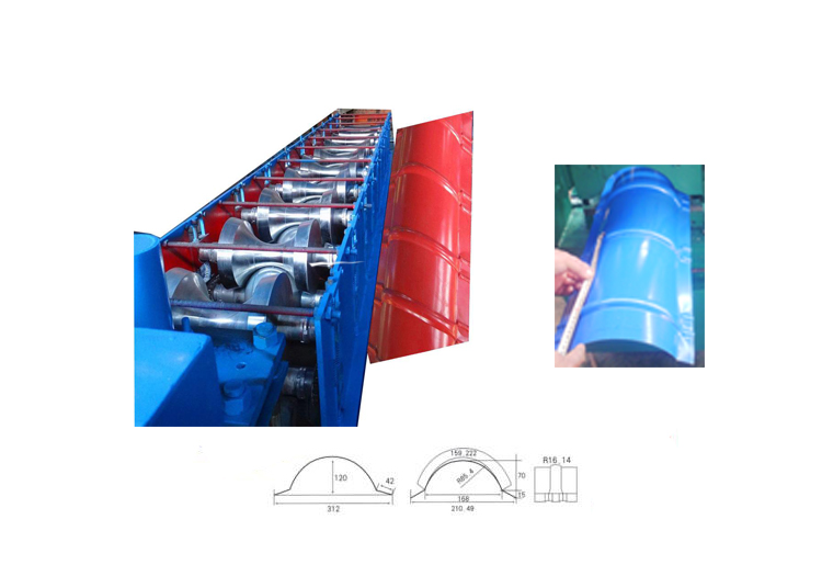 312脊瓦壓型機設備采用300H鋼焊接,液壓馬達傳動,液壓剪切。脊瓦機軋輥材料選用45#鋼鍛打件,表面鍍鉻。